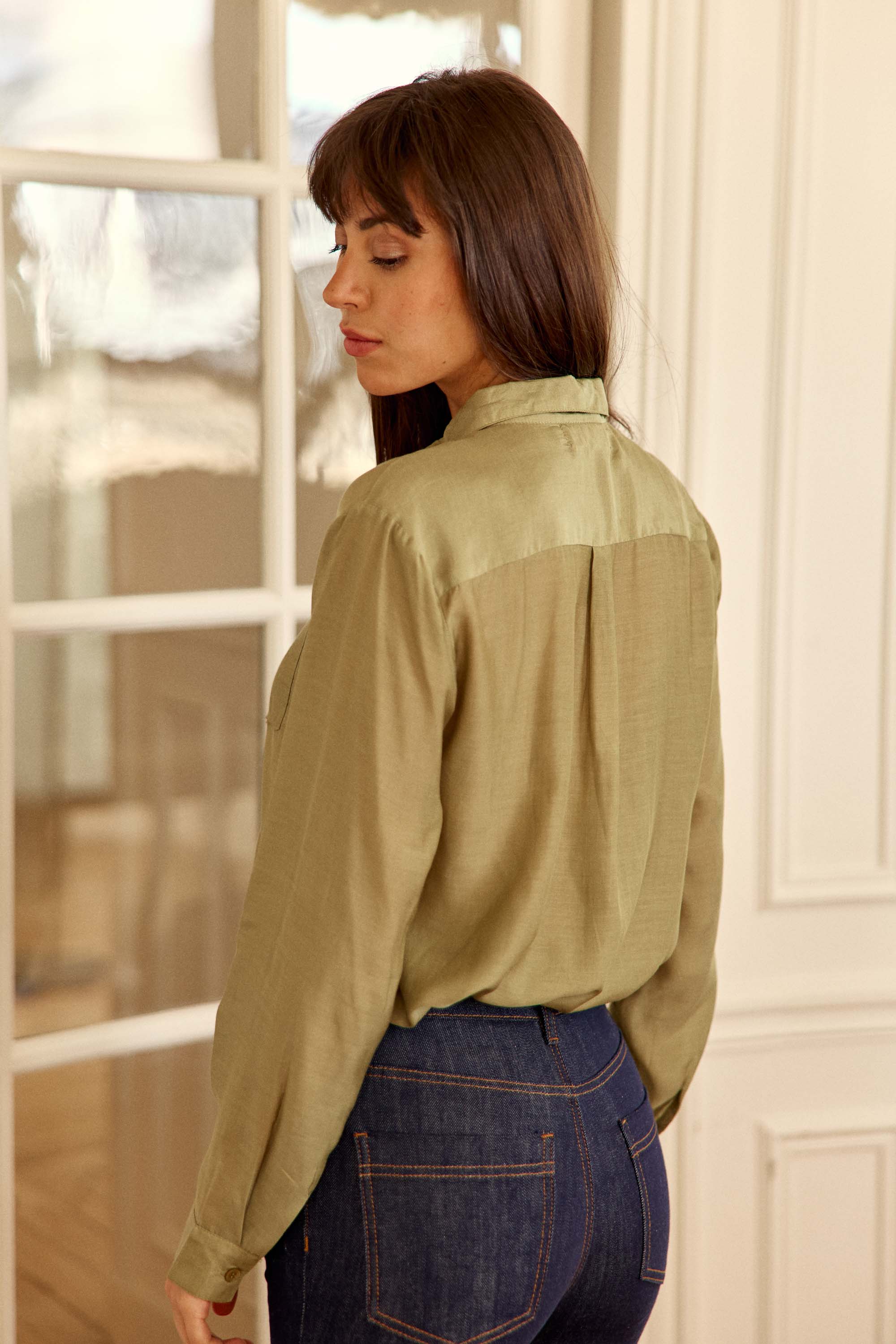 Le chemisier Carlita séduit par son tombé fluide et son tissu satiné au fini délicat.