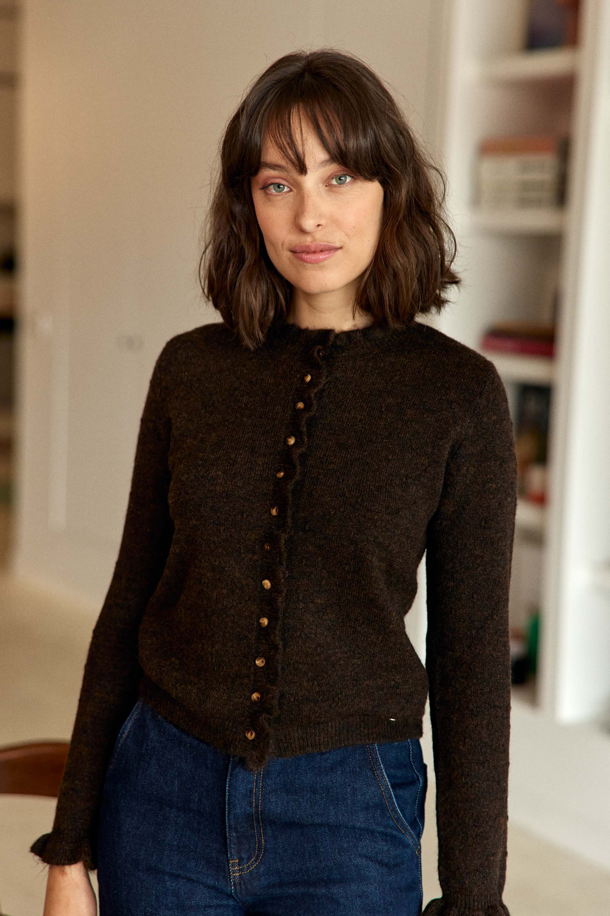 Meatrice. le gilet blousant en maille douce. agrémenté de volants fantaisie pour une touche féminine et élégante.