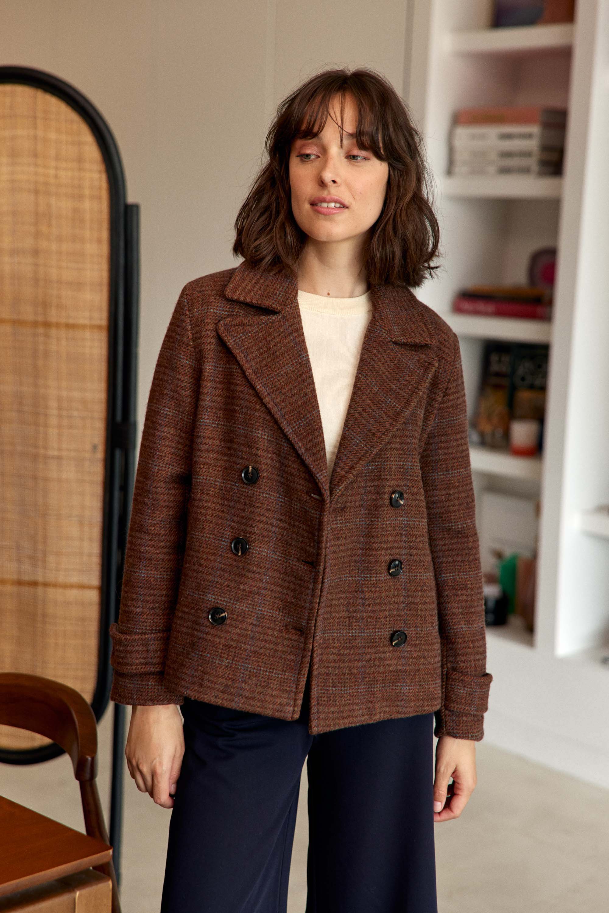 Natalia. le caban à carreaux qui revisite un grand classique avec sa coupe structurée. son col à revers et son élégance intemporelle.