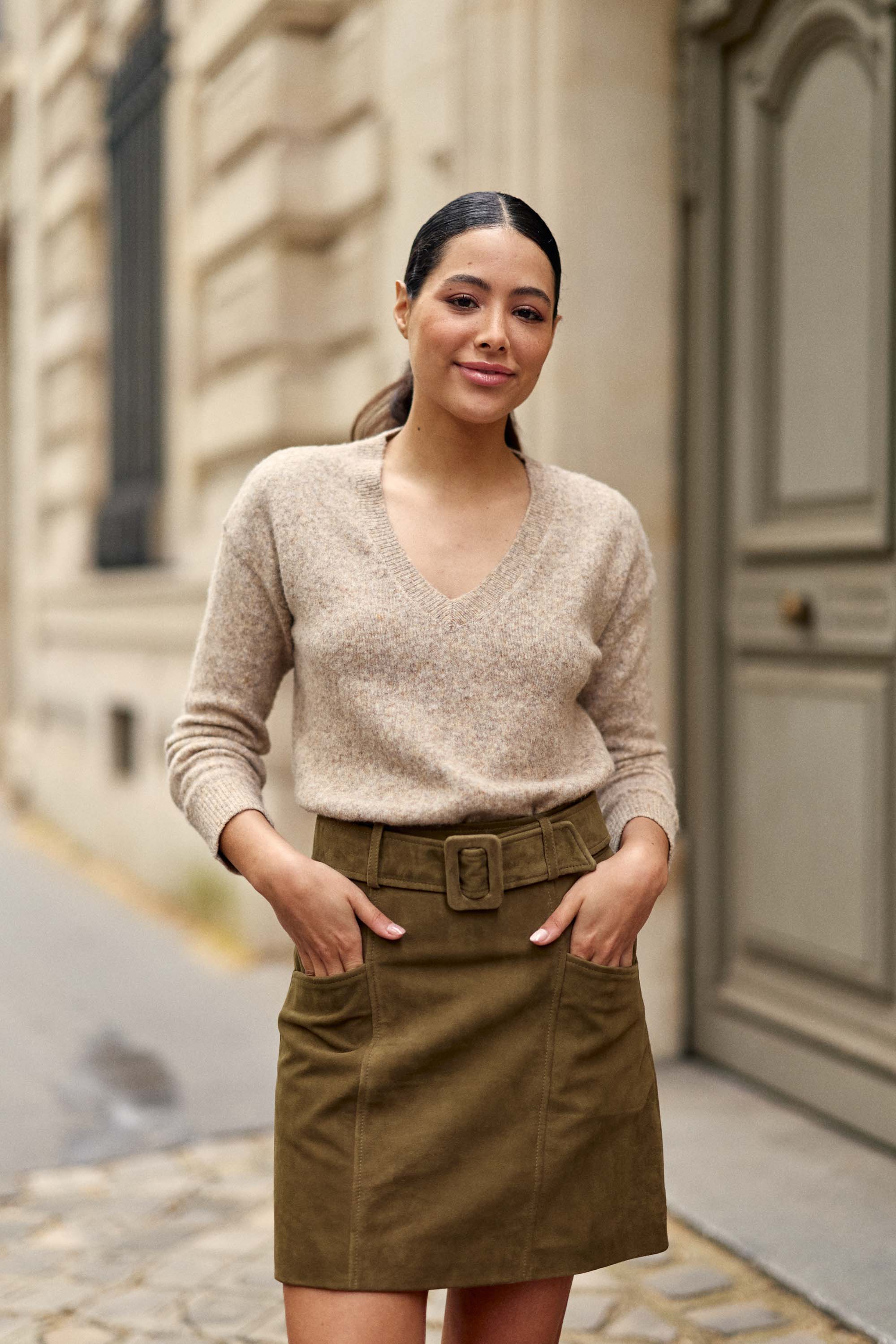 Le pull Mantia camel combine maille chinée. encolure en V et coupe droite légèrement ample pour un confort tout en douceur.