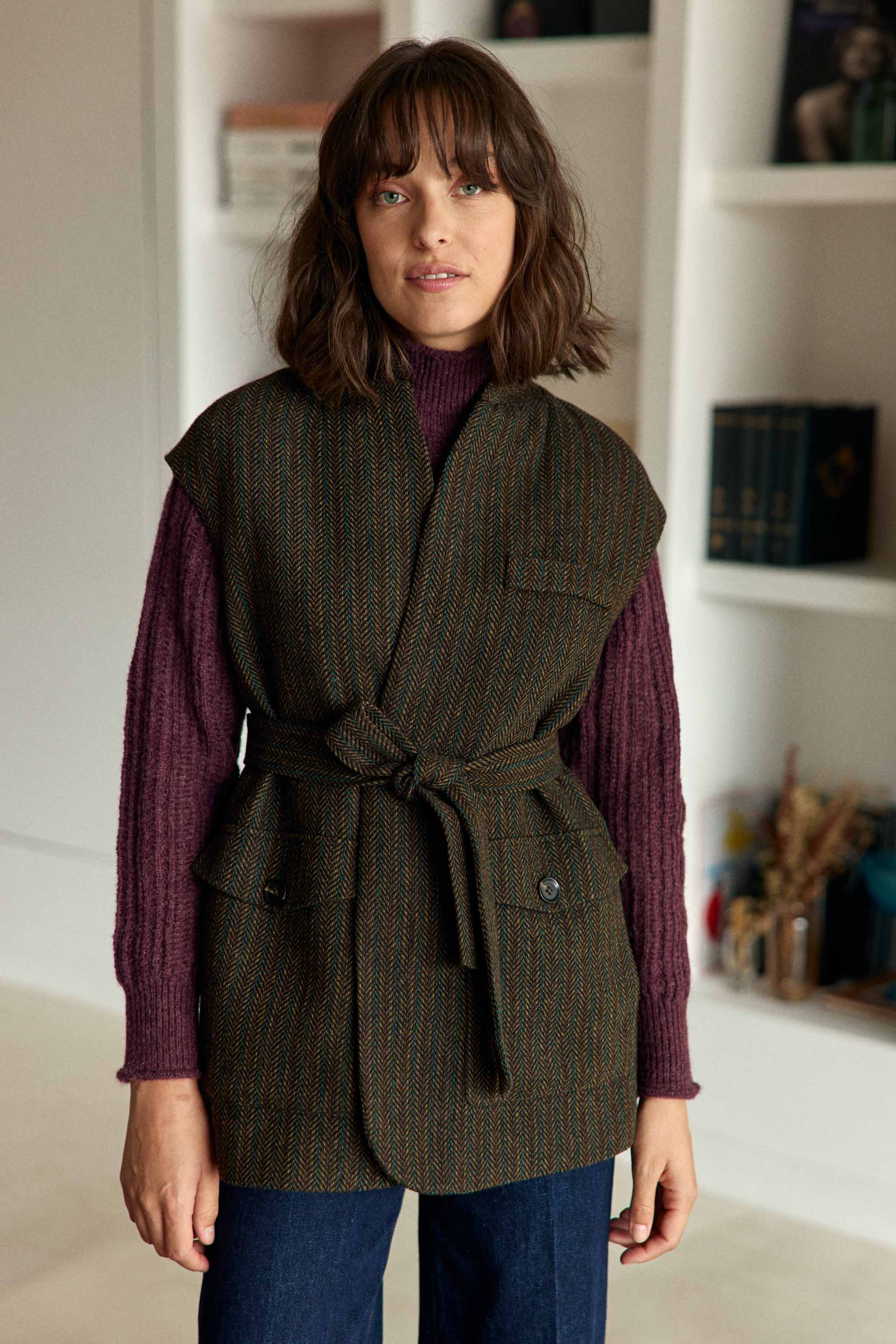 Velia. la veste sans manches au tissage chevron chic et féminine. avec col châle. poches plaquées à rabat et ceinture amovible.
